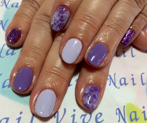ラメやパステル系のいろんなパープルの単色塗りに、ワンポイントでパープルのマーブル柄ベースにドロップネイルをしてまぁす(^-^)/